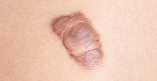 Raised, dark scars that extend beyond the boundary of the original wound.