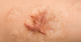 Rough, uneven scars where the skin looks pulled together.